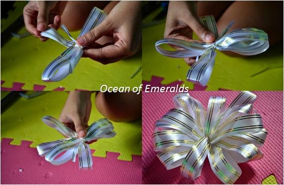 5. Continue to pull out the ribbon alternately (left to right). Repeat the procedure on the opposite (right) side of the ribbon once you're done with the other. Pull upward and twist every after loop and make sure to have them pulled away from each other to make the pom pom effect.